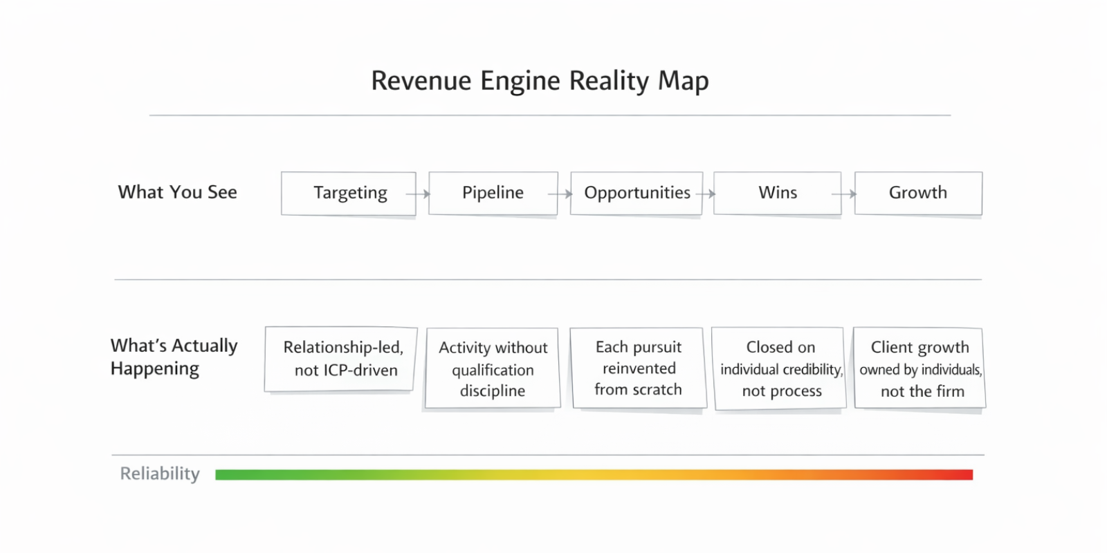 But underneath that visible activity, results may still depend on a small number of people, inconsistent qualification, improvised pursuits, or client relationships the firm cannot really scale.